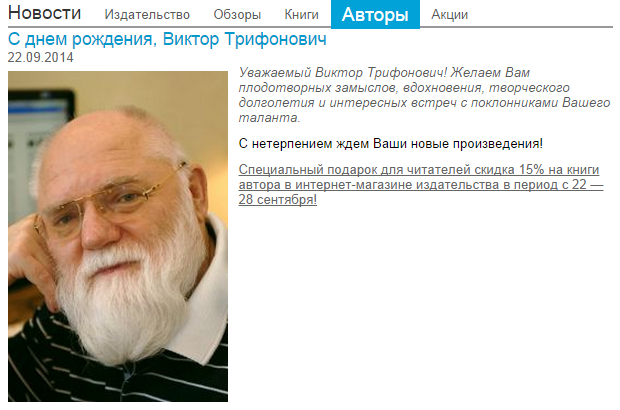 «Литературная газета» с высоты своего 185-летия поздравляет искренне и от всей души молодого ещё человека с Днём рождения. Вы давно стали для нас близким и своим. Рады, что книги Ваши замечательные стоят рядом с нашими номерами на книжных выставках. Такое соседство приятно и обнадёживает. Присоединяемся к многочисленным поздравлениям и пожеланиям, шлём привет из самого центра Москвы. Здоровья, успехов и благополучия!