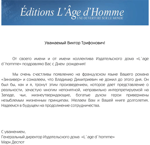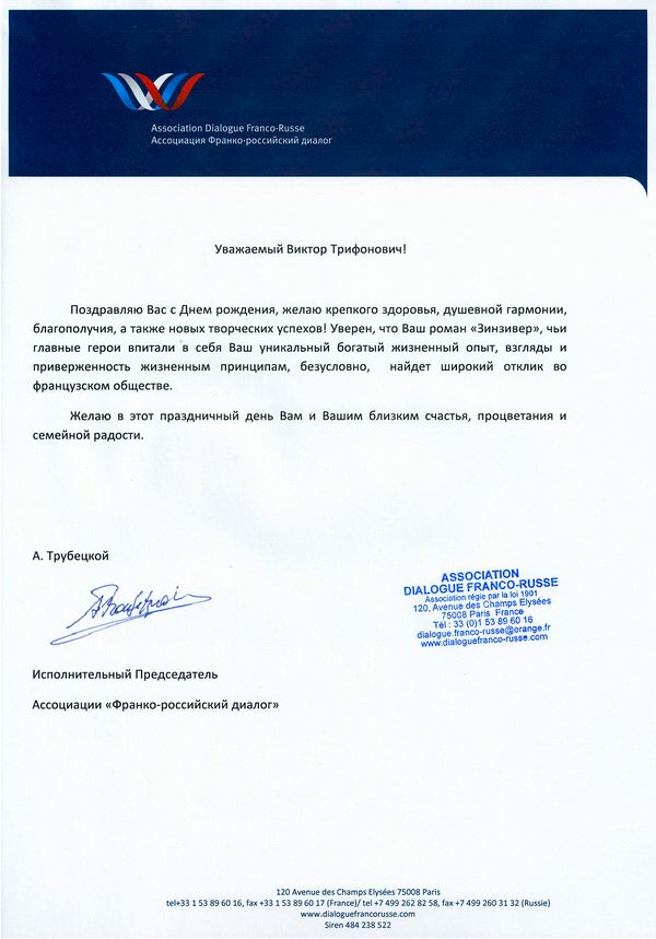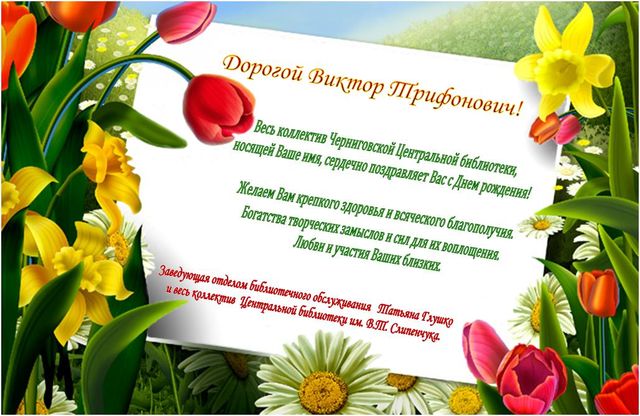 Дорогой Виктор Трифонович! Сердечно поздравляю Вас с днем рождения (правда, уже прошедшим). Желаю Хорошего настроения, творческих успехов, хороших друзей, здоровья Вам и Вашим близким.