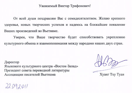 Большое спасибо за поздравление с 70-летием! Большую часть жизни мне довелось прожить в СССР, и я не понаслышке знаю о мужестве вьетнамского народа. В 1965-м, служа в войсковой части 43064 (бронетанковый батальон), я в числе других молодых людей, жаждущих справедливости, написал просьбу, чтобы меня отправили на войну во Вьетнам на помощь братскому вьетнамскому народу.