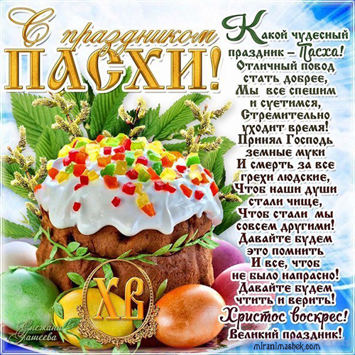 В светлый и торжественный день Пасхи желаю добра, благополучия и мира Вашему дому! Пусть чувство светлой радости не покидает душу как можно дольше. Желаю Вам здоровья крепкого, гармонии, добра, чистоты, духовности, просветления. Сладких куличей, добрых гостей и большой радости!