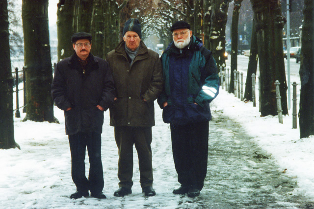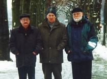 В платановой аллее. Алесь Кожедуб, Василь Быков и Виктор Слипенчук. Франкфурт-на-Майне, 2001 г.