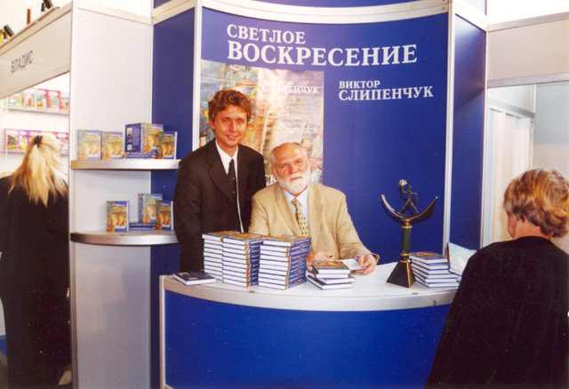 А.Треушников, В.Слипенчук на стенде издательства «Городец». Международная книжная ярмарка, Москва, 2002 г.