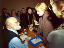 Встреча с читателями в областной библиотеке. Автограф читательнице. Великий Новогород, 2001 г.