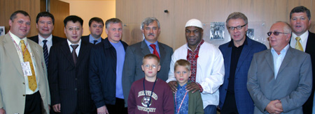 Чемпионат мира по Кёкусин-кан каратэ-до. В кругу известных выдающихся людей два пока неизвестных спортсмена - внуки В.Слипенчука: яхтсмен Ваня Панченко и каратист Гриша Слипенчук. Москва,Лужники,2005. Фото О.Шурыгиной.