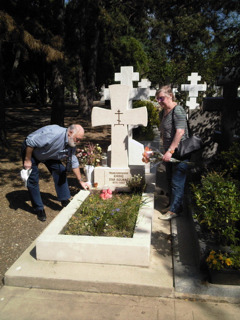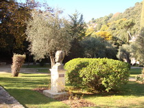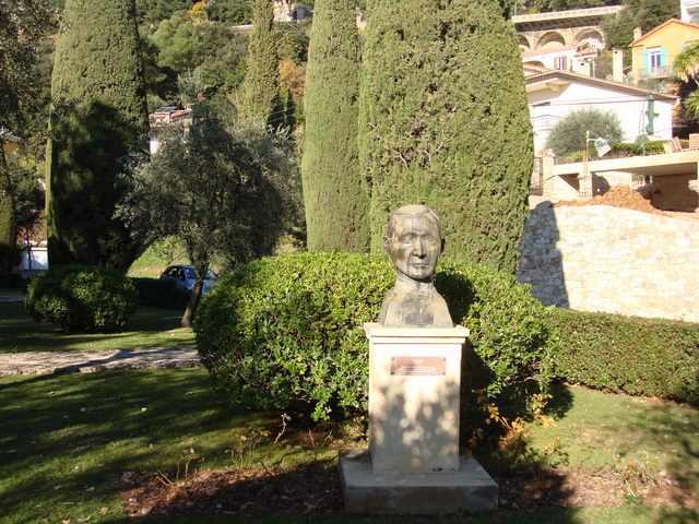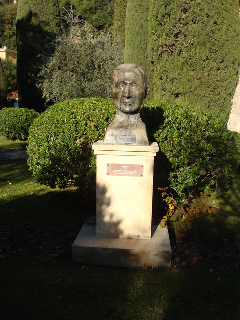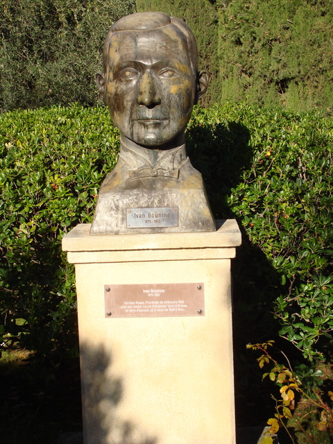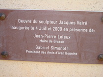 Памятная доска на постаменте бюста И.А.Бунина: «Скульптор Жак Вере. Открыт 4 июля 2000 года. На церемонии открытия присутствовали Мэр города Грасс Жан-Пьер Лелё и Президент ассоциации «Друзья Бунина» Габриэль Симонофф»