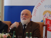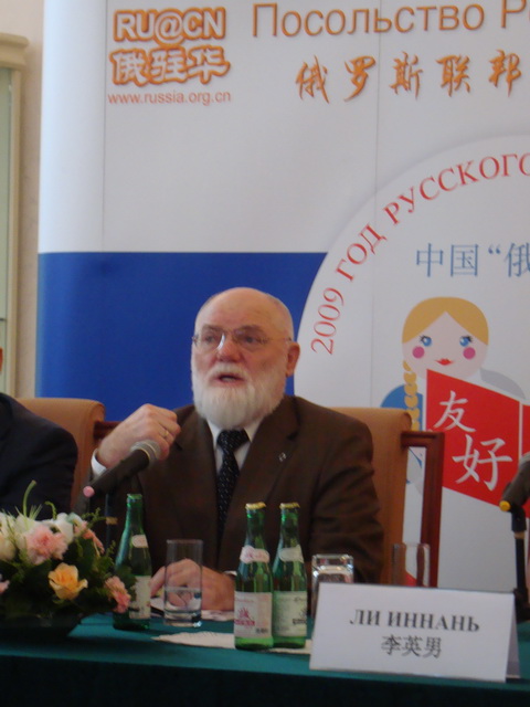 Зал полон | |  Читатели и почитатели русского языка | |  Первое слово – зав. кафедрой русского языка Пекинского университета, профессору Ли Иннань |