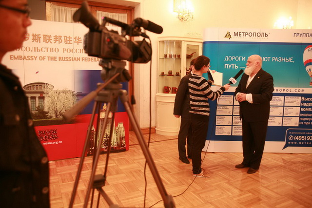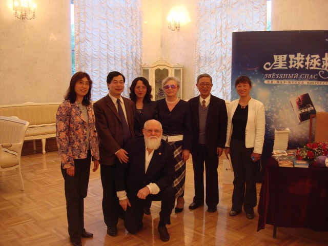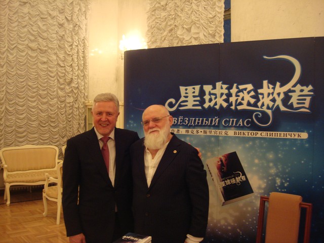 Виктор и Галина Слипенчук в окружении участников презентации. Слева направо: профессор Ву Пинь, в.н.с. Ли Цзюньшень, Вэнь Чжэсянь, гл.ред.изд. «Народная литература», профессор Ли Минбинь, переводчик «Звёздного Спаса» Фэн Хуаинь (группа переводчиков: Хэ Маочжэн, Фэн Хуаинь и Джу Шаохуа) | |  Интервью Пекинскому телевидению BTV | |  |