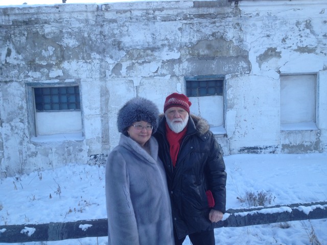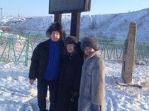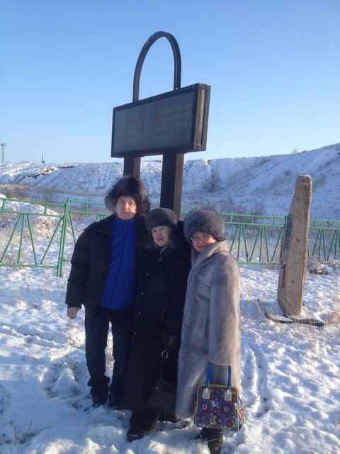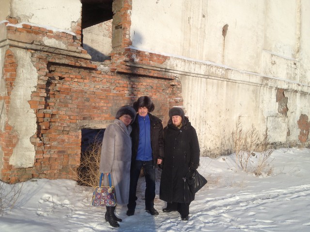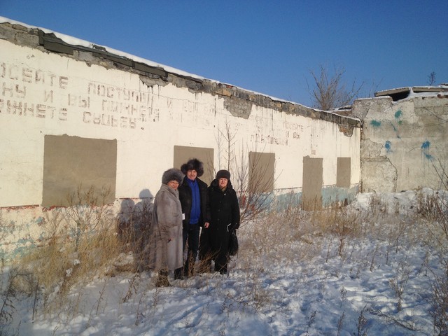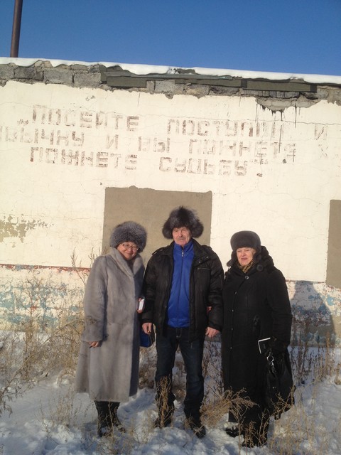 Виктор Слипенчук, Алма Кульниязова (журналист) и Виктор Кадык (предприниматель) на фоне овощехранилища, построенного заключенными. Действует и поныне.