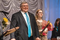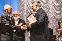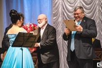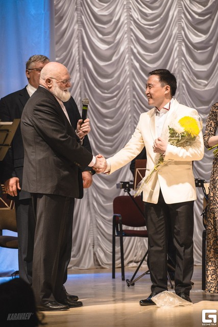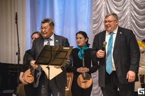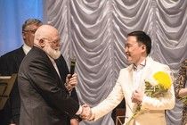 Депутат ГД РФ Михаил Слипенчук и Депутат Народного Хурала Баир Цыренов вручают артистам памятные дипломы участников концерта
