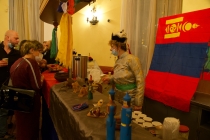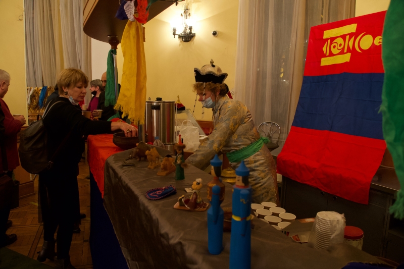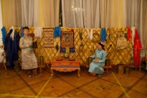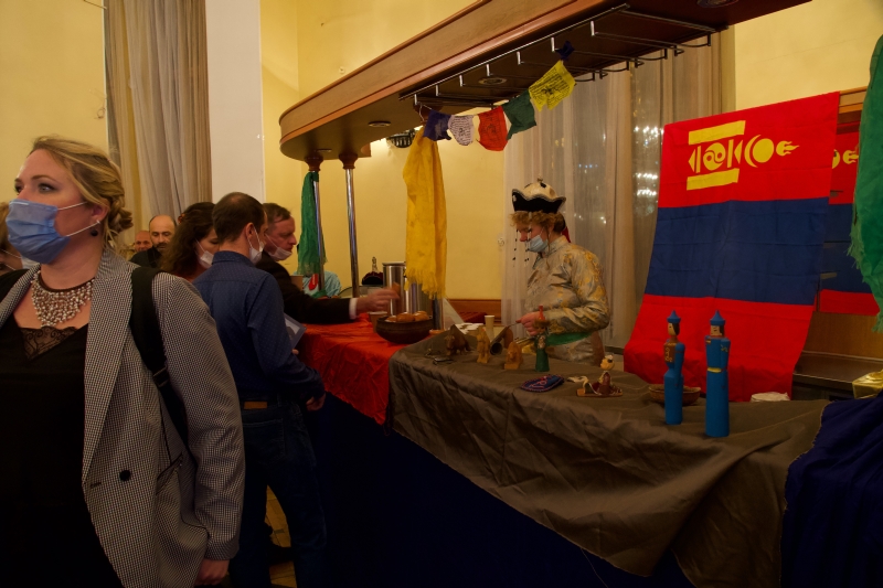 Девушки в костюмах этнического стиля угощают гостей особым монгольским чаем с молоком и солью