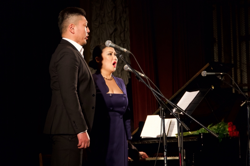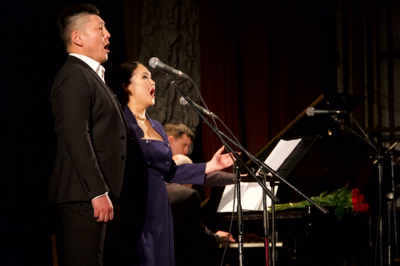 Ольга Жигмитова и Чингис Раднаев под аккомпанемент композитора В. А. Усовича исполняют одно из программных произведений В.Т. Слипенчука «Свет времени»