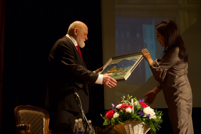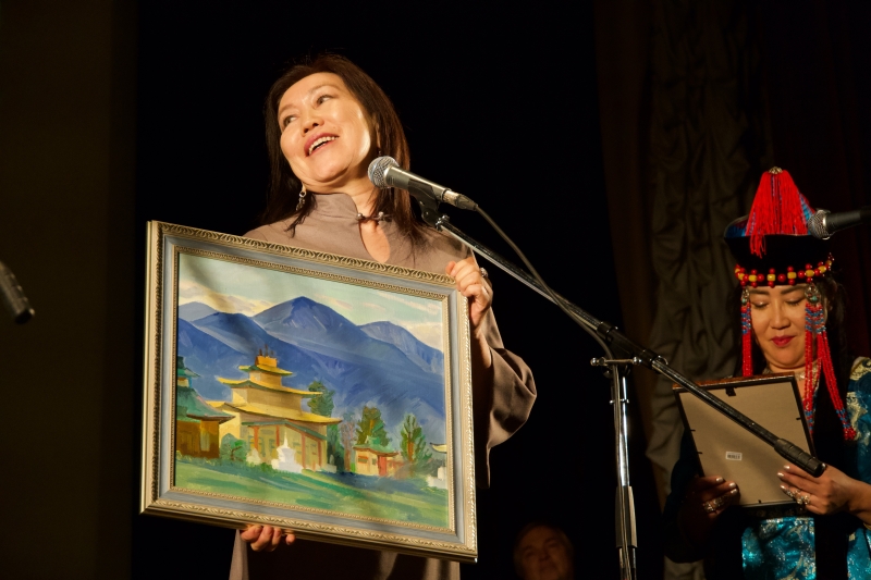 Известная журналистка из Улан-Удэ Туяна Зондуева поздравила юбиляра за вклад в культуру от министерства культуры Бурятии, зачитав Благодарственное письмо. От себя лично преподнесла картину «Свидание»