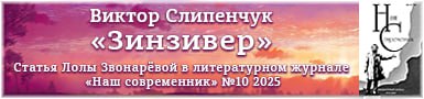 Читать здесь 29.12.2025В литературном журнале «Наш современник» (№10 2025 г.) в рубрике «Книжный обзор» опубликована статья Лолы Звонарёвой «Тайны русской души в переводе на английский, или ключ к нашему будущему» о романе Виктора Слипенчука «Зинзивер» на английском языке.